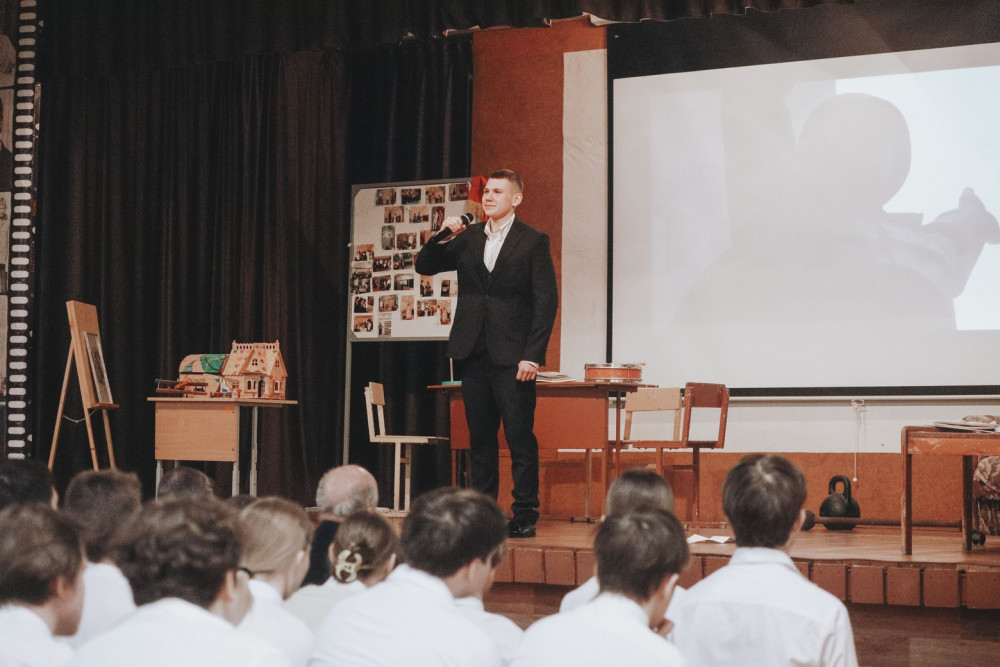 В этом году на уроке мужества присутствовали и ученики других школ – воспитанники военно-спортивного клуба «Пантера», подшефного «Маринс Групп». После мероприятия ребята возложили цветы к мемориальным стенду и доске на фасаде школы, а также на доме, где жил герой.