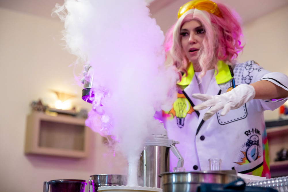 Гости центра приготовили для ребят несколько сюрпризов. Сначала все удивлялись чудесам химического шоу. Вместе с любительницей опытов Джесси замораживали и размораживали воздушные шары, создавали из жидкого азота «снежки» и пробовали на вкус научный коктейль.